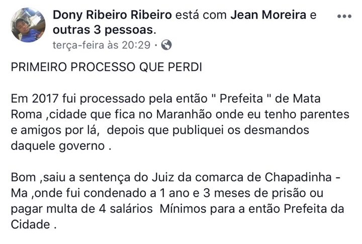 O jovem identificado por Nardonio Teixeira Ribeiro, foi denunciado na Polícia Civil e na Justiça por disseminar denúncias caluniosas a gestão de Mata Roma e a ex-prefeita Carmem Neto.